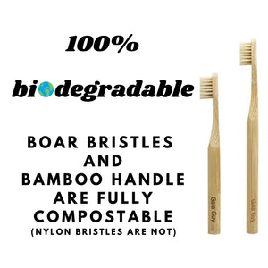 Our bamboo toothbrushes are made with natural, renewable resources, including hygienic and less abrasive boar bristle fibers.ย Byย using our bamboo and boar hair toothbrushes, you're helping to reduce plastic pollution and even methane gases that would have come from the disposal of these boar bristles in landfill.ย This is a zero waste solution!