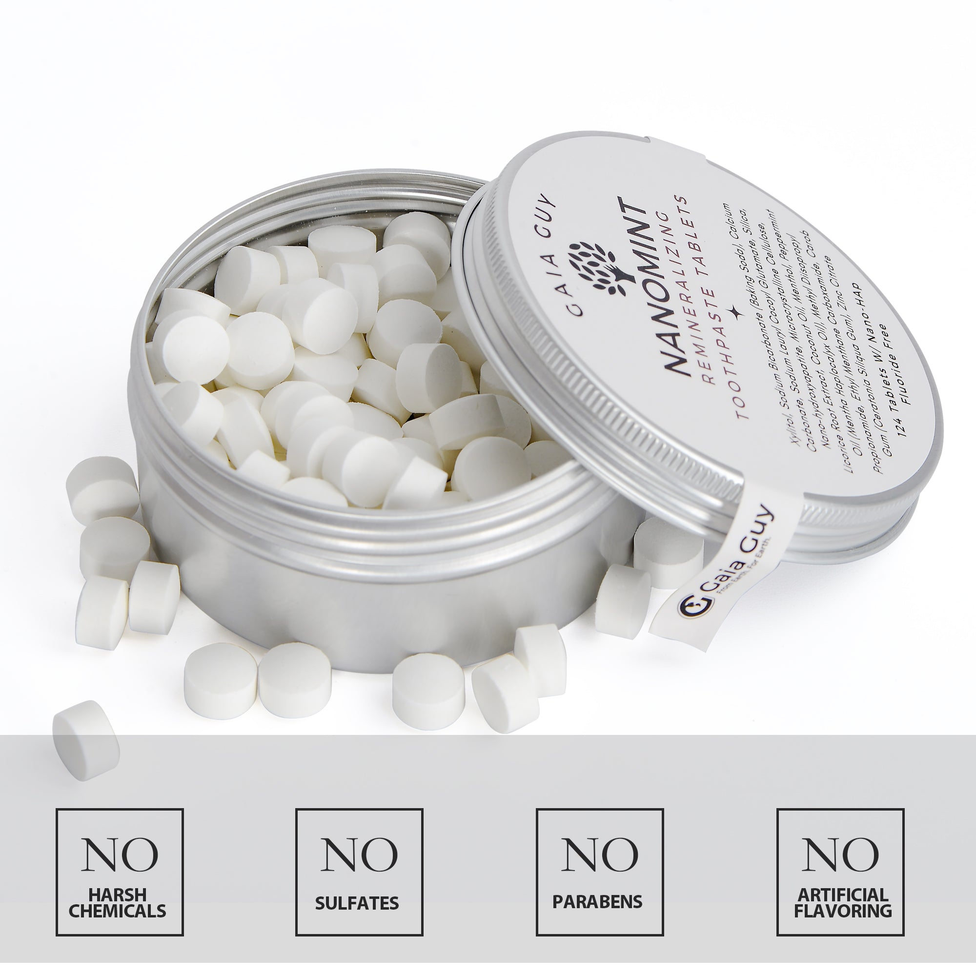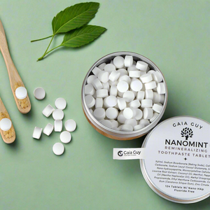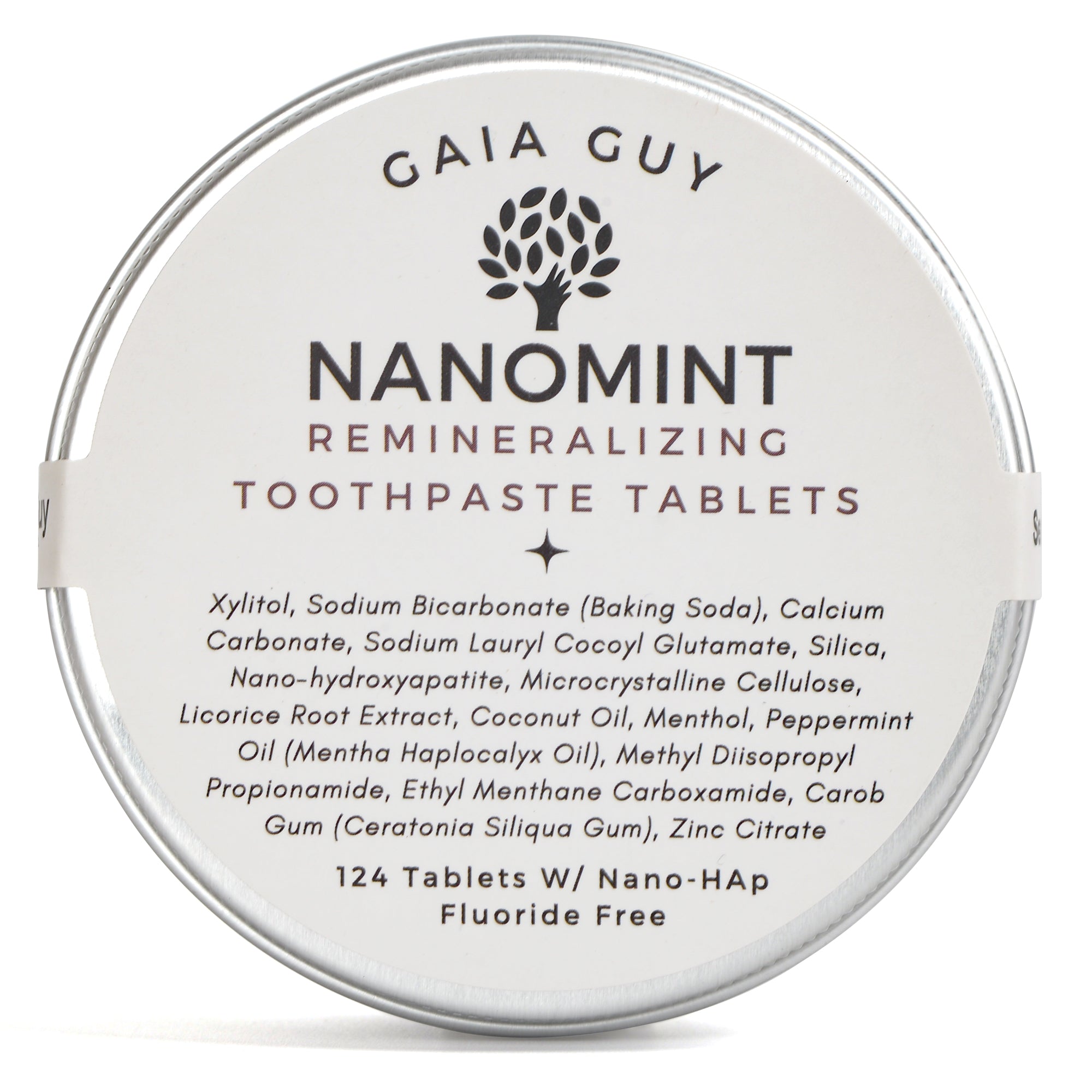 Gaia Guy's NanoMint Toothpaste Tablets are more than an alternative; they're a seamless addition to your daily dental routine. Convenient and easy to use, simply chew or crush, wet your toothbrush, brush, and rinse (Recommended: Spit out any extra toothpaste after brushing and avoid rinsing with water or mouthwash right away. Wait at least 20-30 minutes before rinsing, eating, or drinking to improve the toothpaste's impact on strengthening enamel. – because your smile deserves the best, effortlessly.