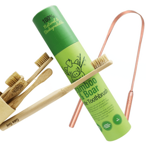 The best selling 6 pack of Bamboo and Boar Bristle Toothbrushes and a Copper Tongue Scraper will change your mouth for the better.