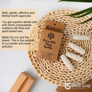 Gaia Guy Biodegradable and Eco-friendly Silk Floss Refill, your perfect choice for a gentle and smooth flossing experience without artificial flavors. Our unflavored, plant-based candelilla wax ensures both your oral health and environmental well-being.