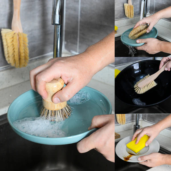 This eco-friendly brush and sponge set is a great way to help the environment. It is made of natural materials that are not harmful and can be composted or recycled when you are done with them. The whole dish cleaning set is 100% plastic-free and contains no harmful microplastics, polyester or nylon. The packaging is also environmentally friendly.