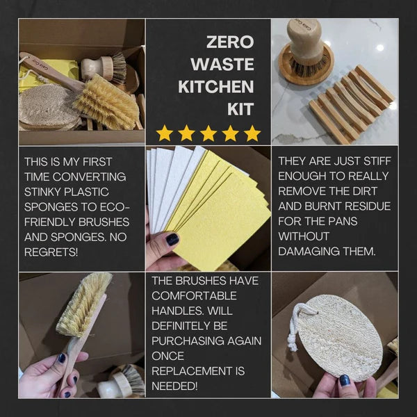 This Zero Waste Kitchen Kit is designed for the modern sustainable household. Featuring a sustainable bamboo pot scrubber, a wood dish brush, loofah sponges, plastic-free cellulose sponges, a bamboo brush holder and a wood soap tray - this kit has everything you need to keep your kitchen clean and waste-free.